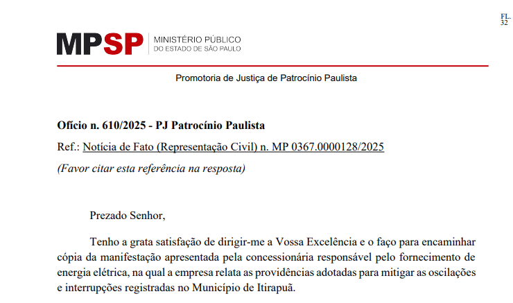 A Câmara Municipal de Itirapuã recebeu, nesta semana, o retorno oficial do Ministério Público e da CPFL referente ao Ofício nº 001/2025, enviado pelo Legislativo para relatar as constantes quedas e oscilações no fornecimento de energia que vêm prejudicando moradores, comércios e serviços essenciais no município.